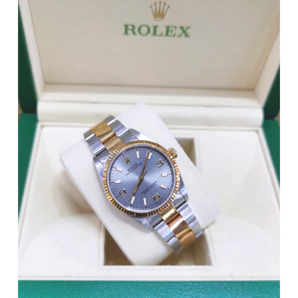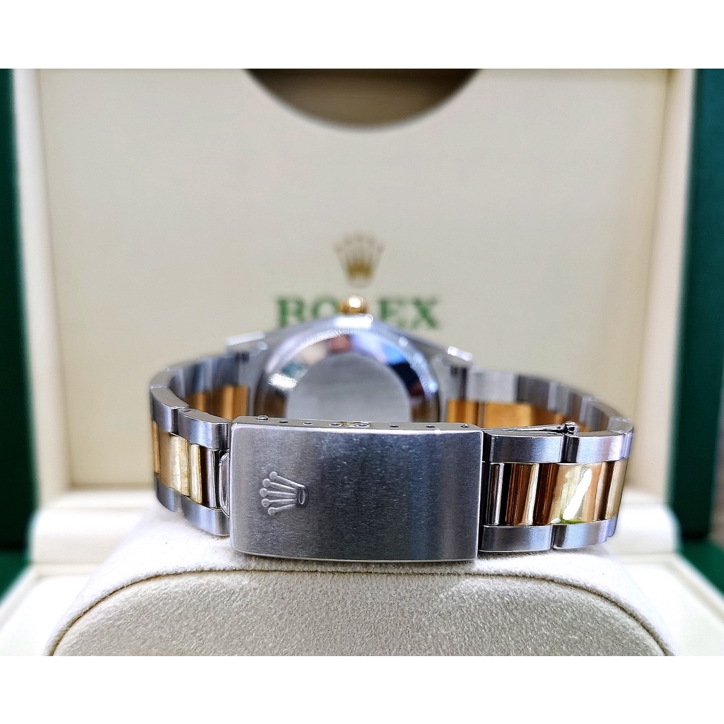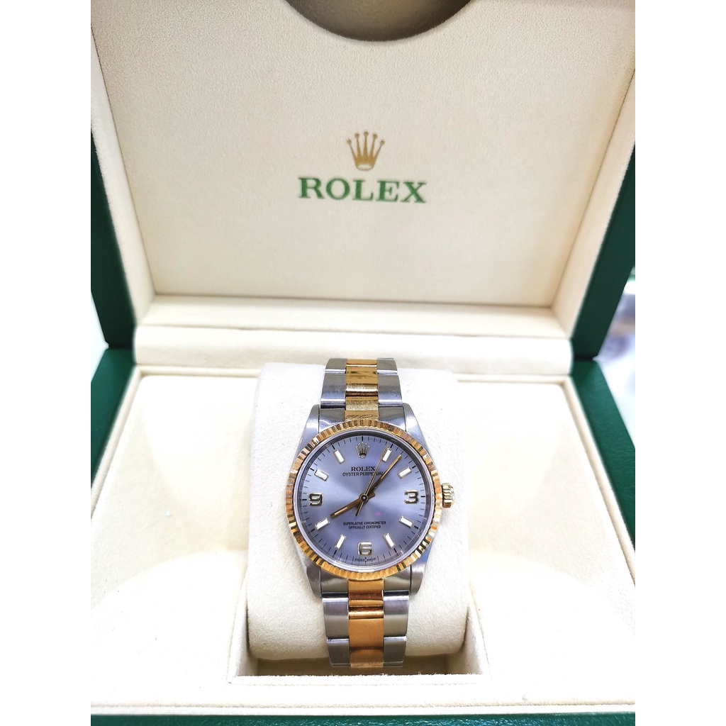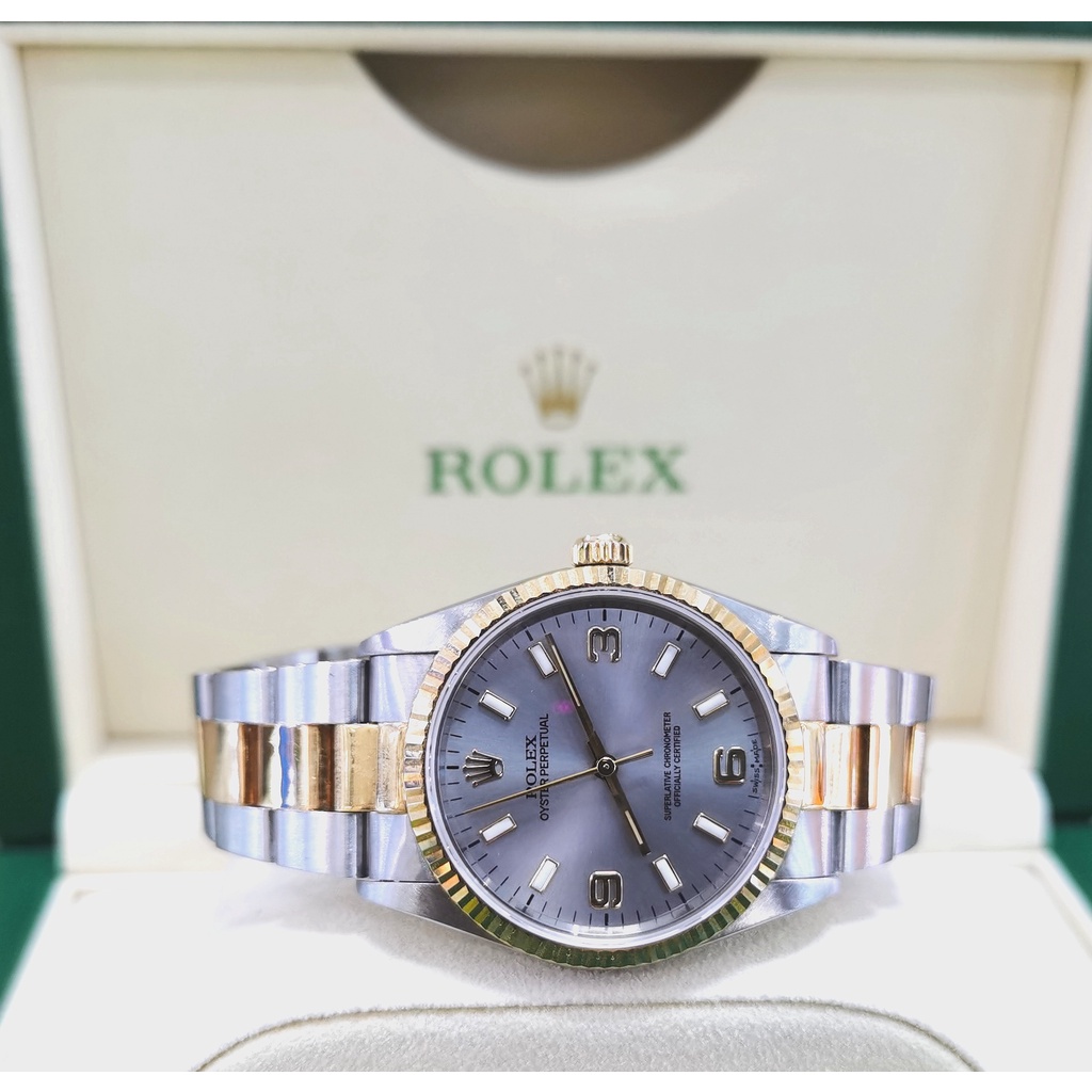 Brand Rolex Model Oyster Perpetual 34 Reference number 14233 Movement Automatic Case material Steel Bracelet material Steel Year of production 1991 Condition (Worn with little to no signs of wear) Scope of delivery Watchs Only Gender Men's watch/Unisex Location Subang Jaya Summit mall Caliber Movement Automatic Case Case material Steel Case diameter 34 mm Water resistance 10 ATM Dial Grey Dial numerals Arabic numerals Bracelet/strap Bracelet material Steel Bracelet color Yellow Clasp Buckle